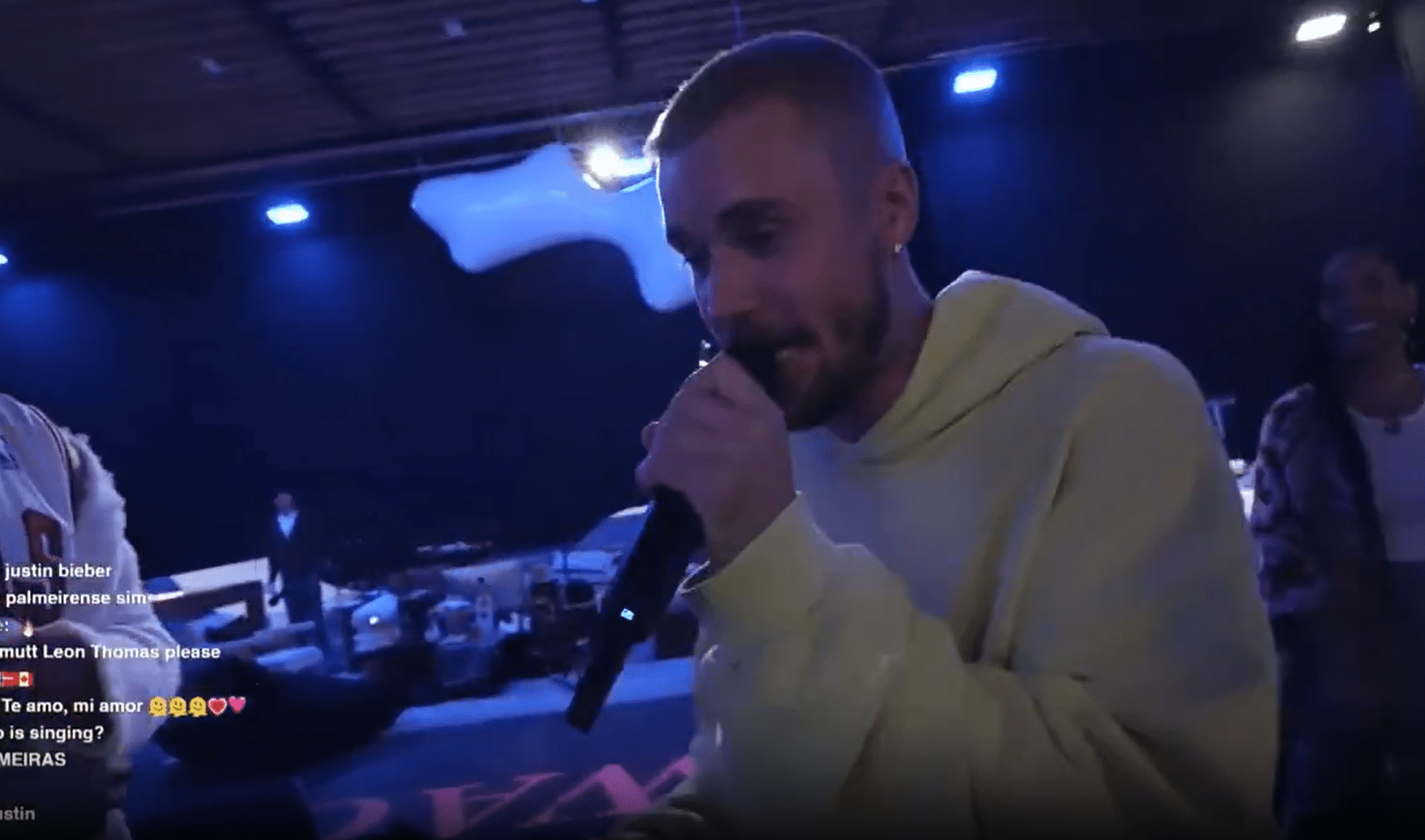 A popszupersztár a Twitch-en élőzött egy hatalmas raktárépületben található próbaterméből, miközben a 2026-os Coachella fesztiválon való fellépésére készült. Barátai a közelben táncoltak, míg Bieber rappelt, igaz néhány sorban megbicsaklott.